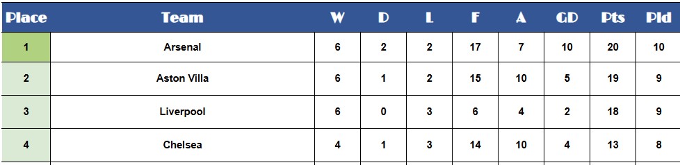 From a men’s perspective, Arsenal lead the way followed closely by Aston Villa. However, Arsenal have played an extra game.