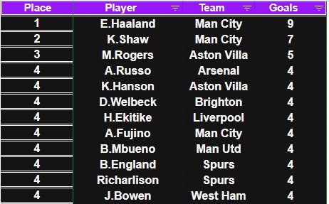 City also head the goal-scoring charts in both male and female categories. Erling Haaland leads with nine goals and Bunny Shaw follows closely on seven.
