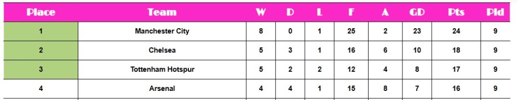 For the women, Man City are way out on front followed surprisingly by Spurs.